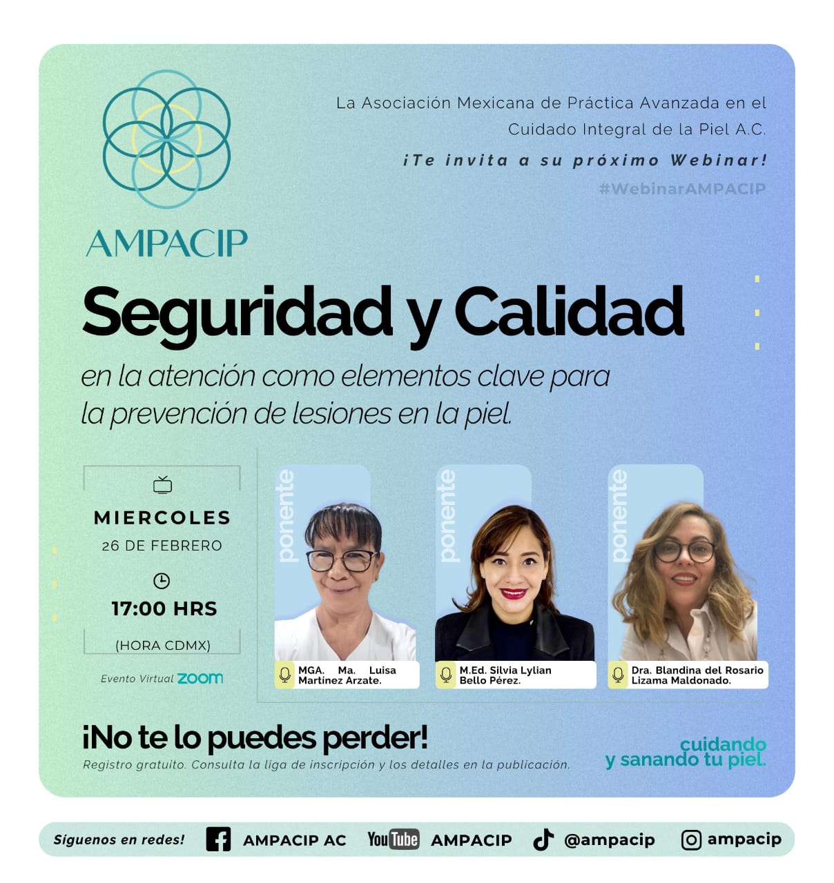 ZoomWebinar dirigido a personal del área de salud Seguridad y calidad en la atención como elementos clave para la prevención de lesiones en la piel Miércoles 26 de febrero de 2025, vía ZOOM. 5:00 pm, hora CDMX Webinar sin costo. No afiliados. En caso de requerir constancia inversión de $150. Las constancias solo se envían …