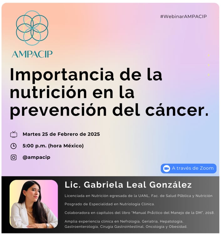 ZoomPrimer webinar dirigido al público en general Importancia de la nutrición en la prevención del cáncer Martes 25 de febrero de 2025, vía ZOOM. 5:00 pm, hora CDMX. Webinar sin costo. No afiliados. En caso de requerir constancia inversión de $150. Las constancias solo se envían al cubrir más del 90% de permanencia en la …